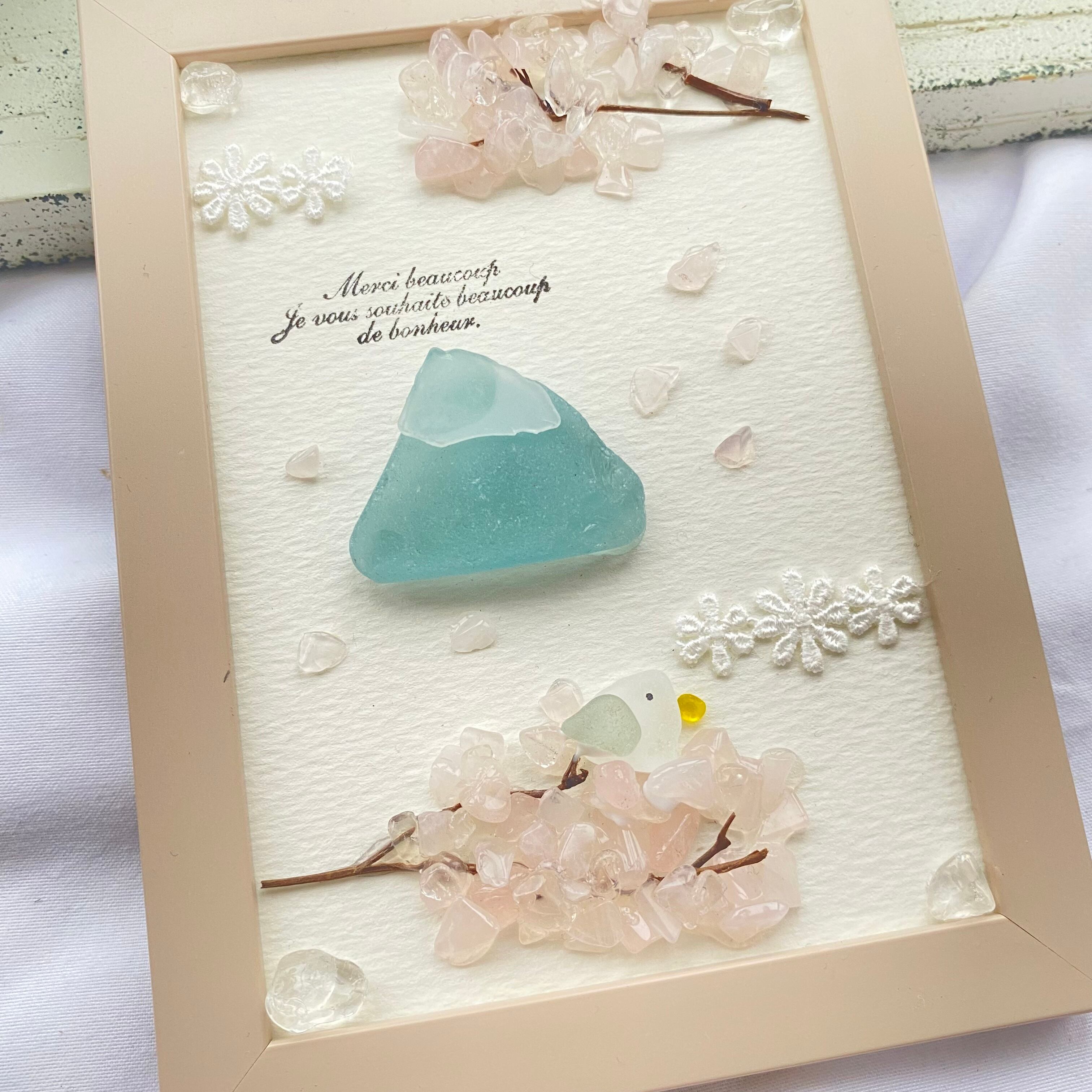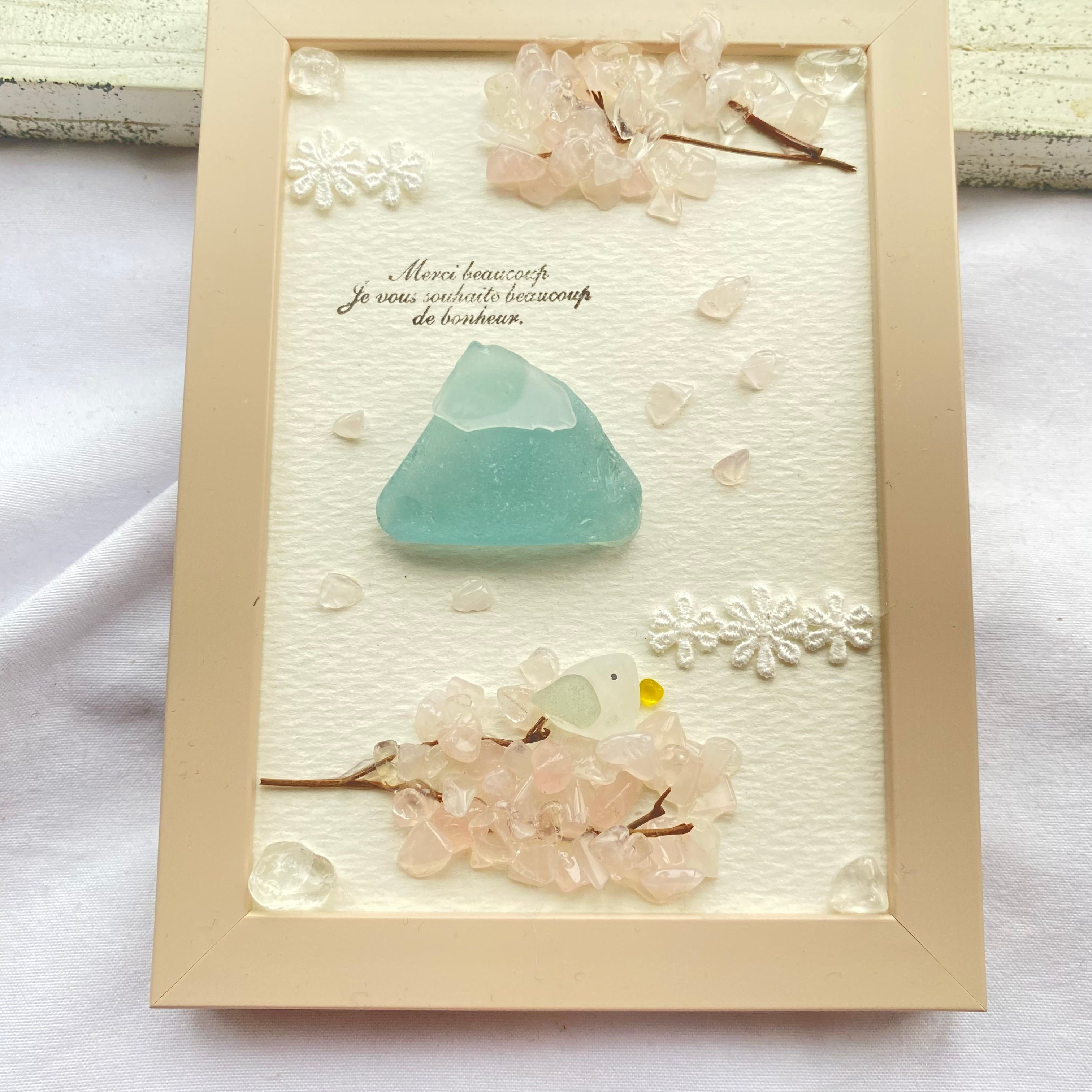 シーグラスの富士山と小鳥とローズクォーツの日本の春の風景の作品です。
