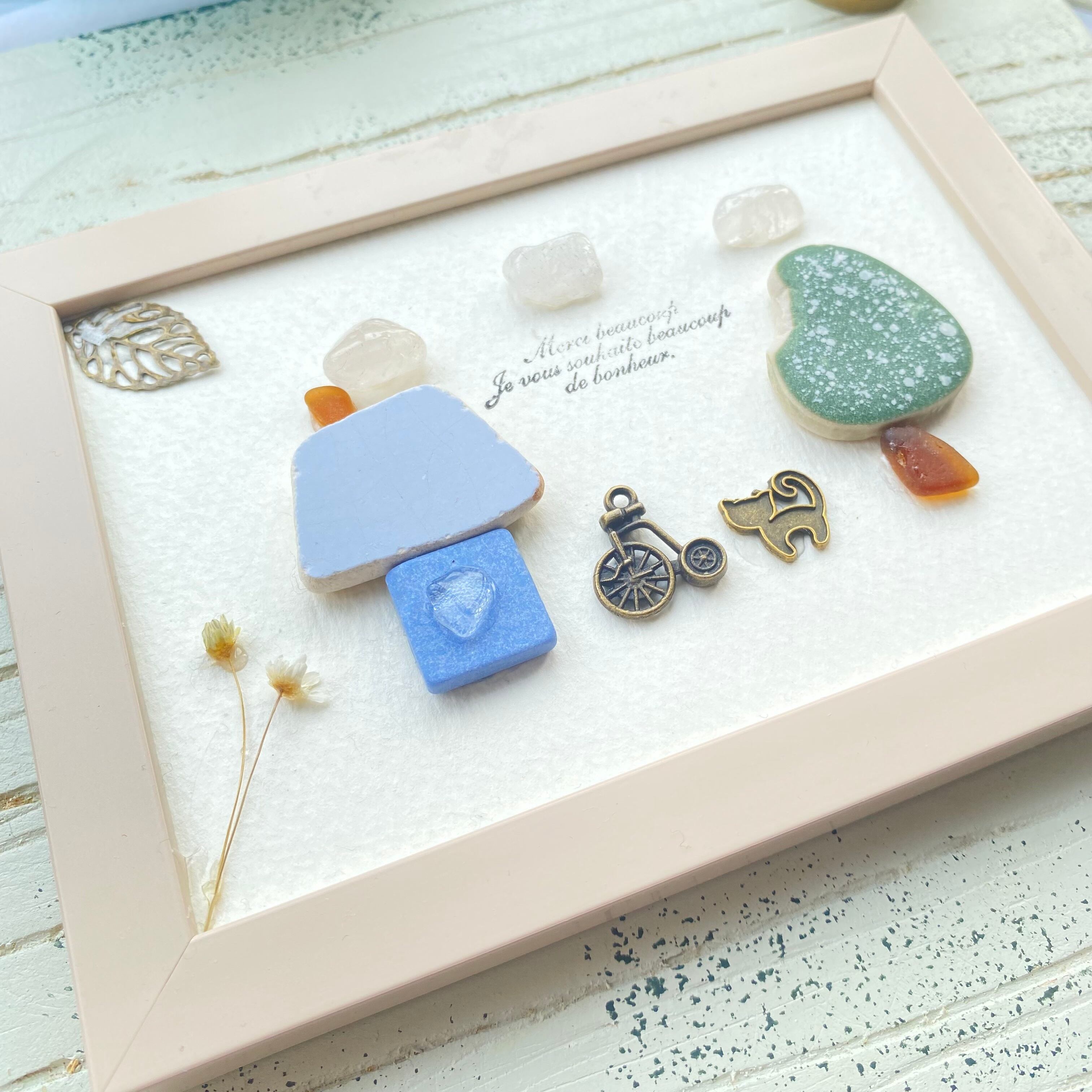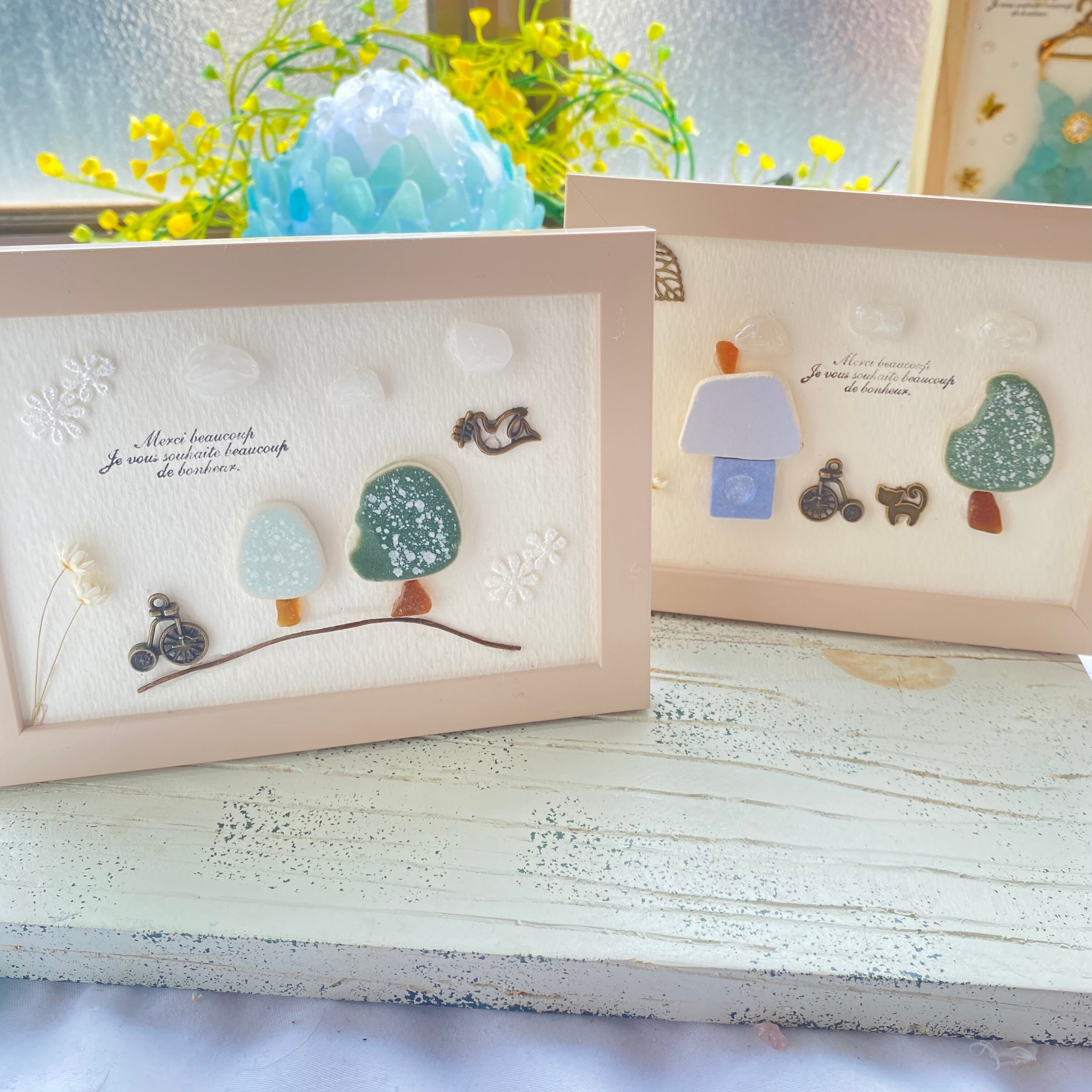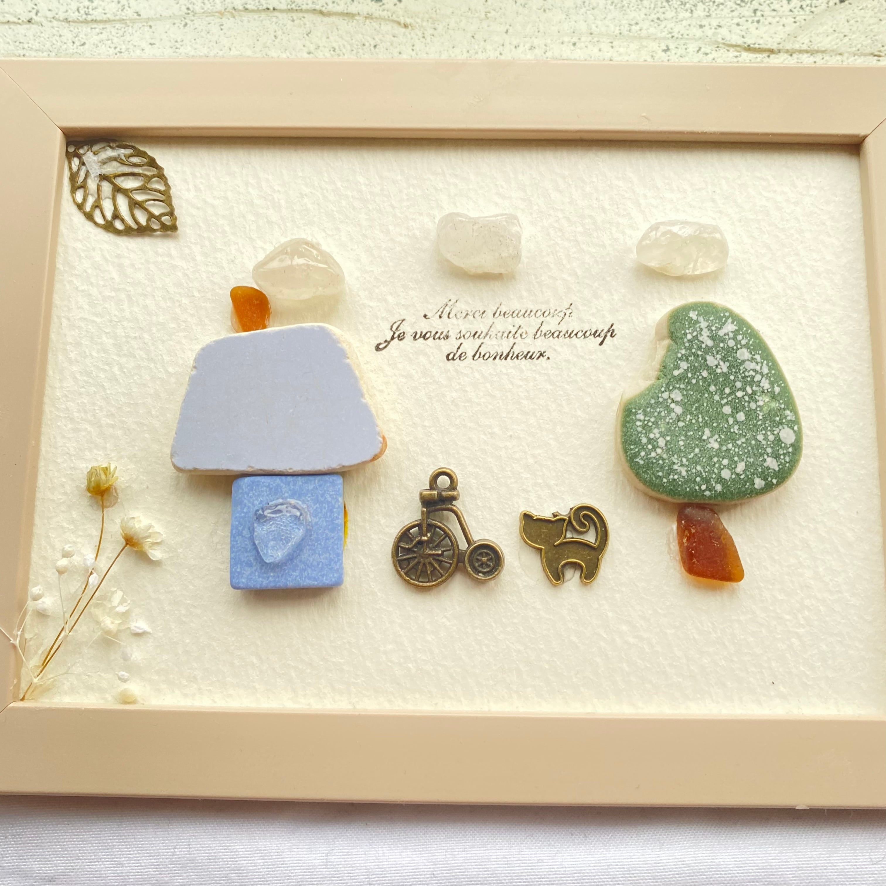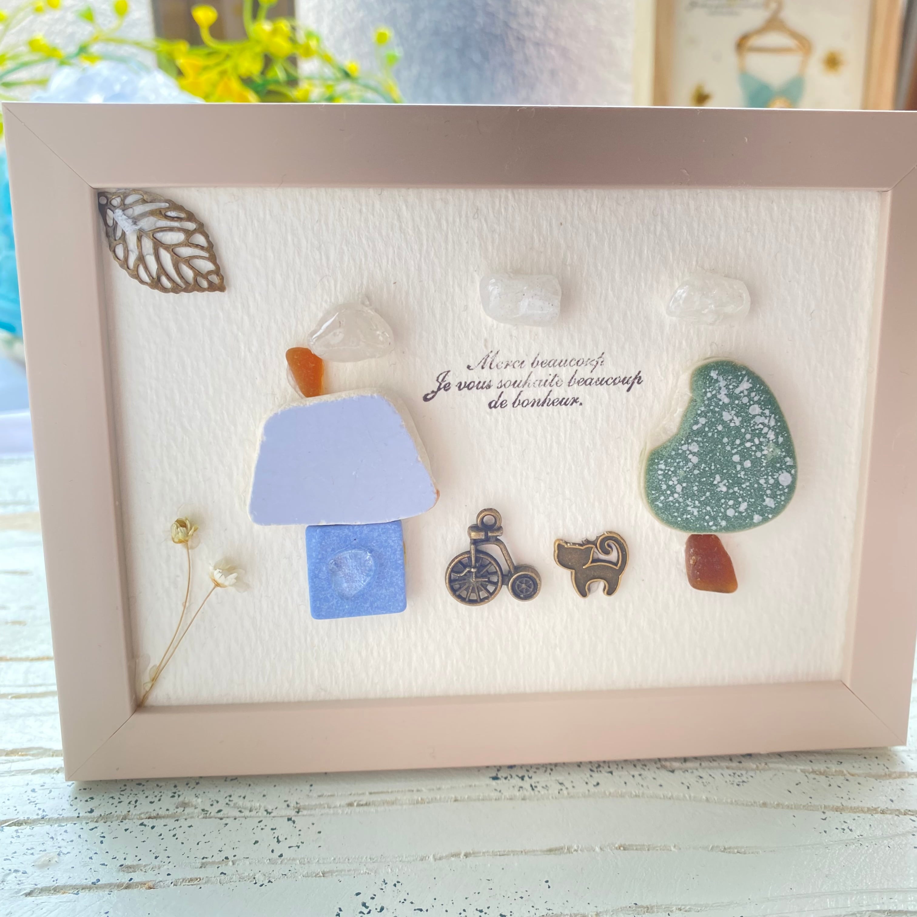 海の宝物、シータイルでできたおうちと木の可愛い作品です。シータイルのお家は猫が住んでいるおうちです。