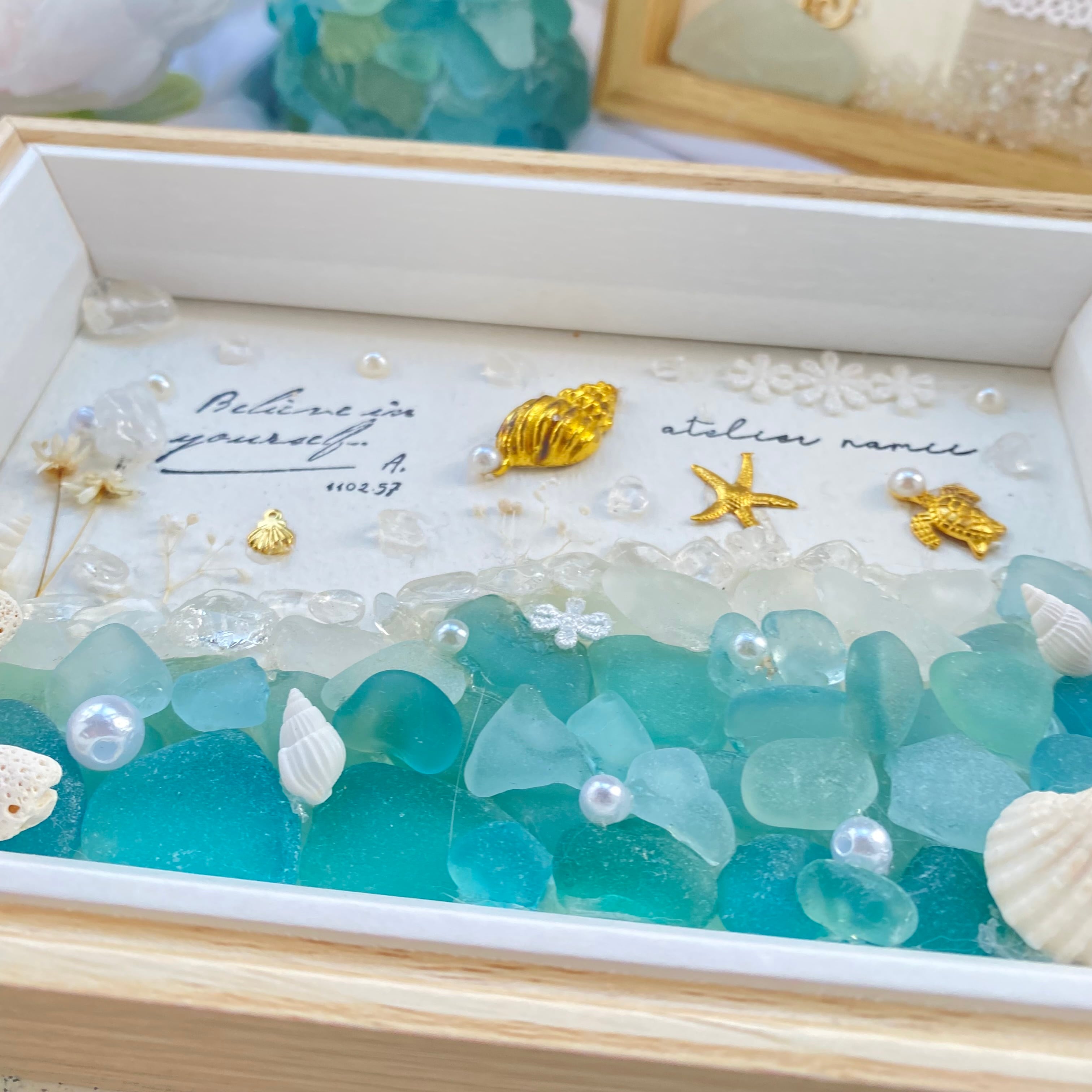 海の癒しのパワー溢れるシーグラスの海の作品です。水晶も沢山使われていて浄化のパワーも強いのでお部屋の浄化アイテムとしてもおすすめです