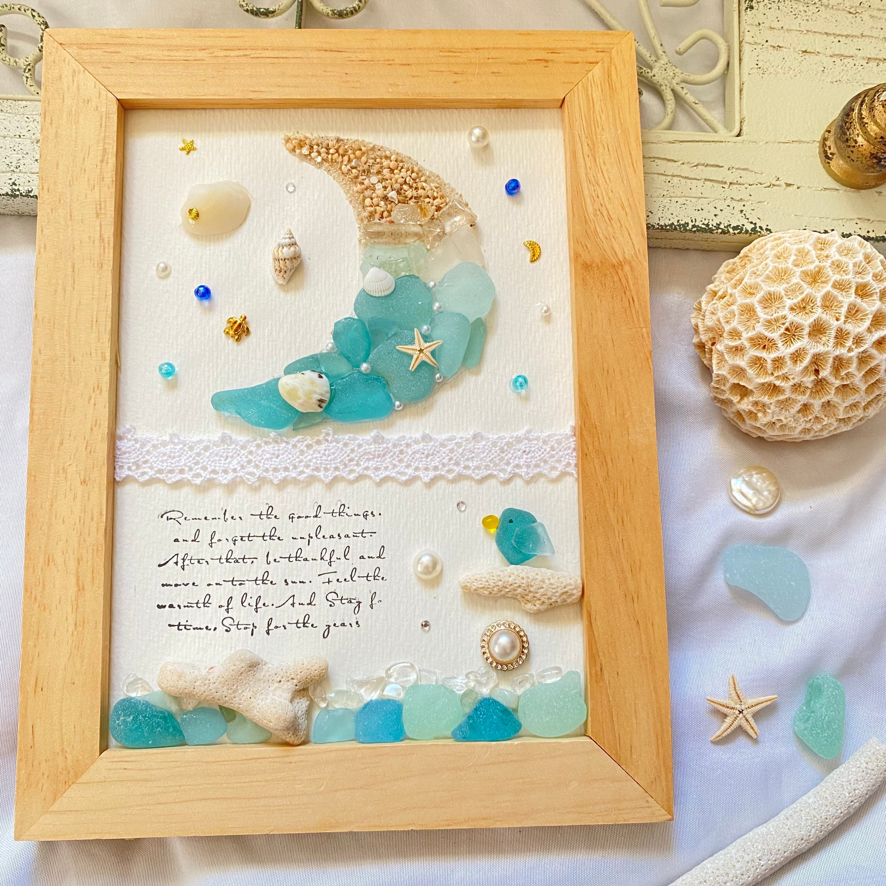 願いが叶う星の砂。星の砂の砂浜はきっとパワーに溢れる。沖縄の竹富島の海をイメージした青いきれいな海を月の形に。