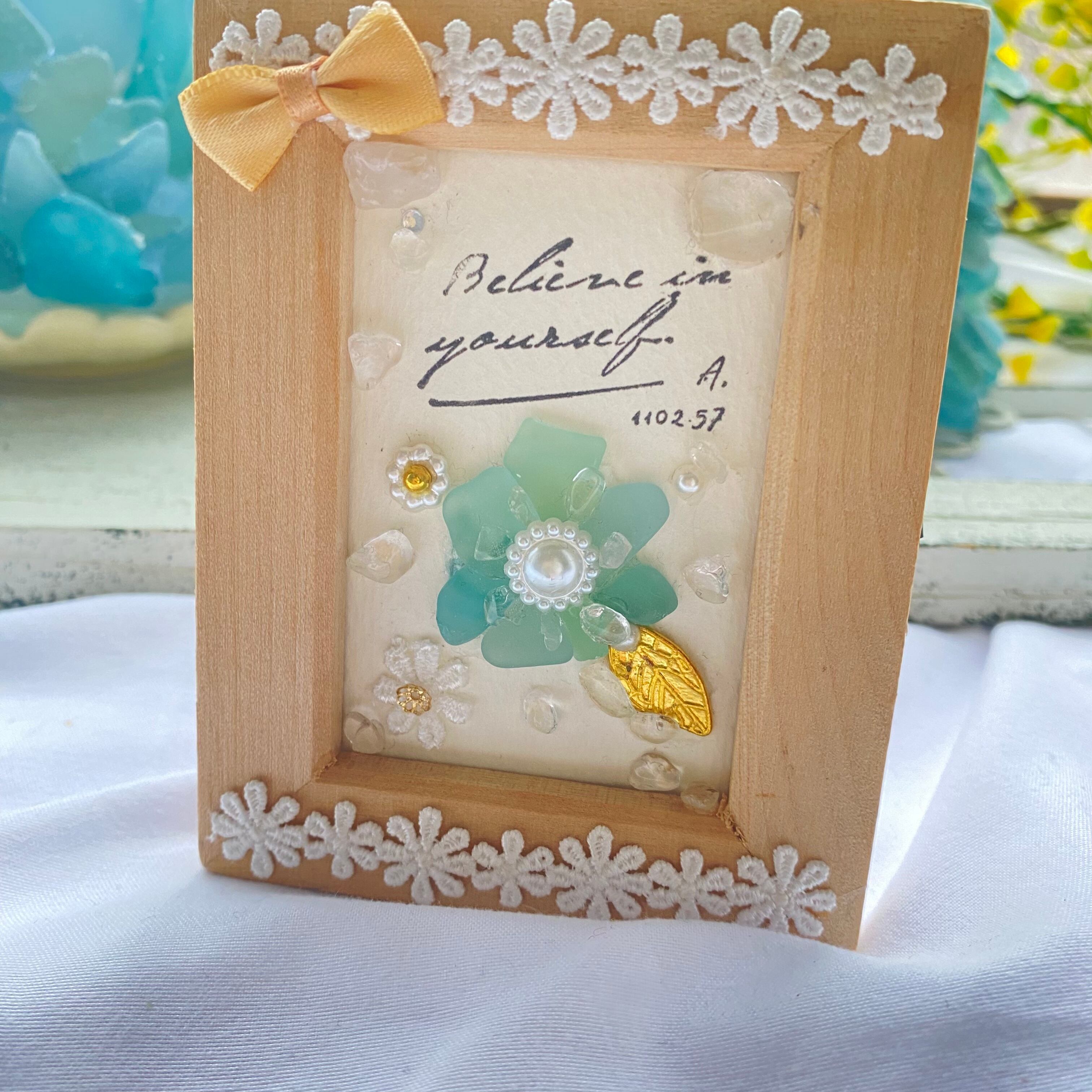 青いシーグラスの花の可愛いミニフレームの作品です。