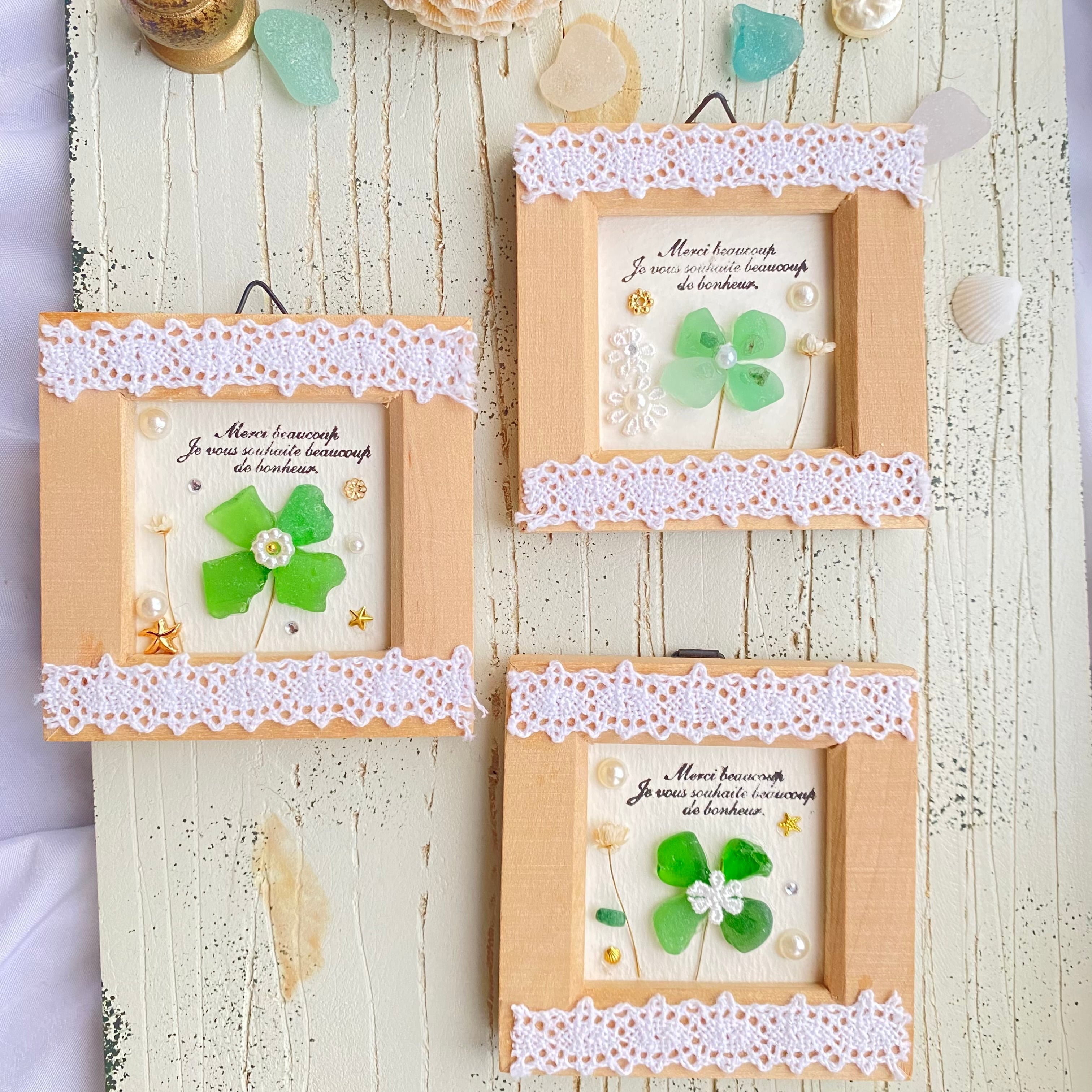 小さな額の四つ葉のグローバーの作品はひとつでも可愛いですし並べてみるとさらに可愛くなりました。