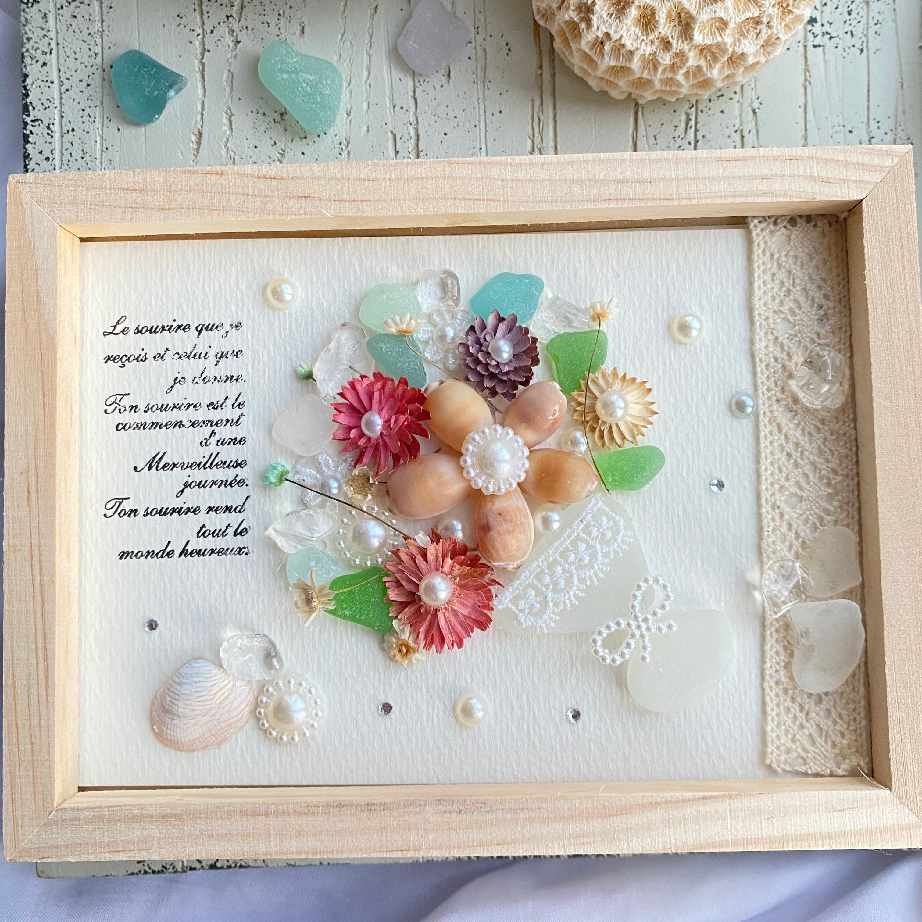 色味のついたドライフラワーとシーグラスと貝殻の組み合わせは合うのか?と思いながら作り始めましたが
