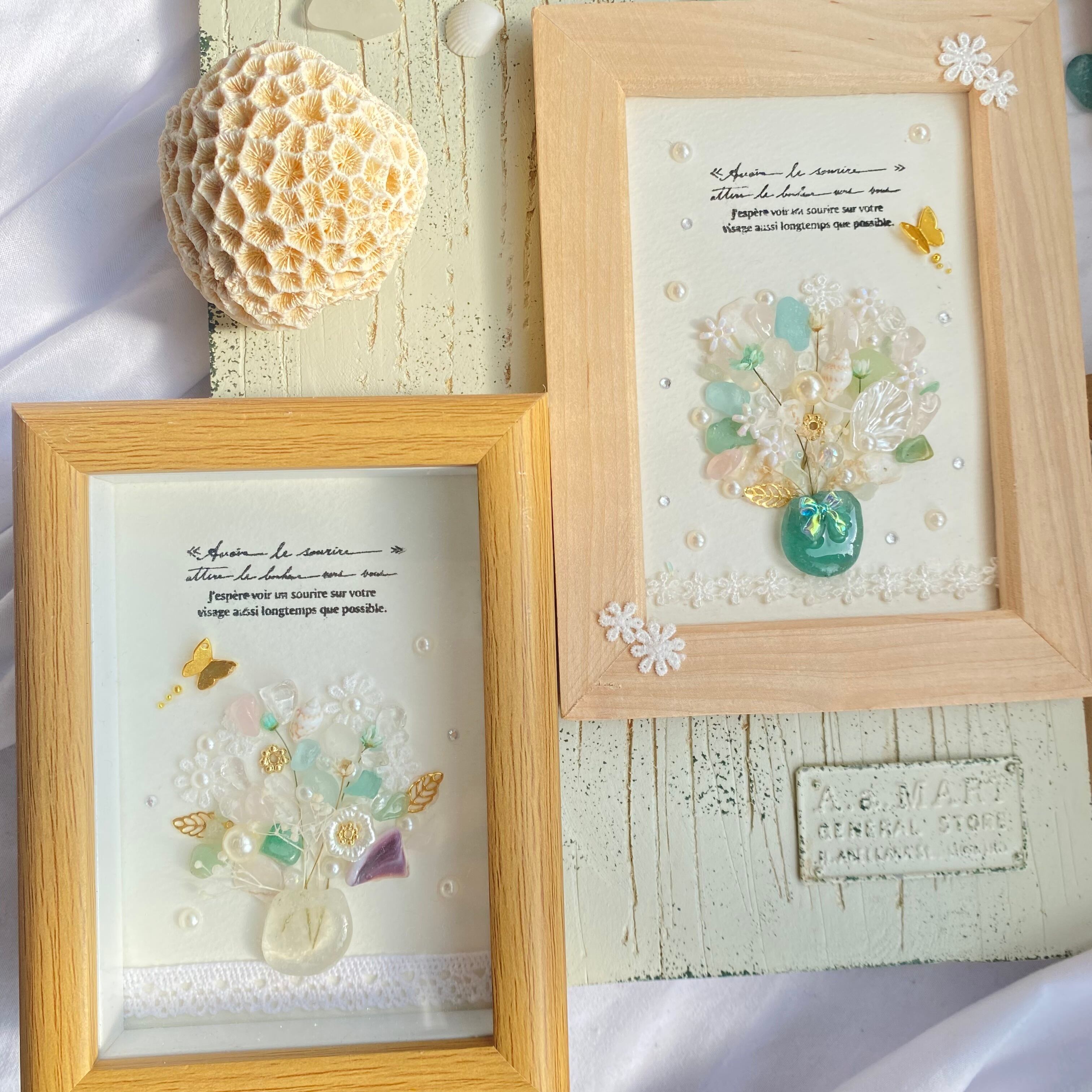 貝殻やシーグラス、様々なモチーフを使って作られた