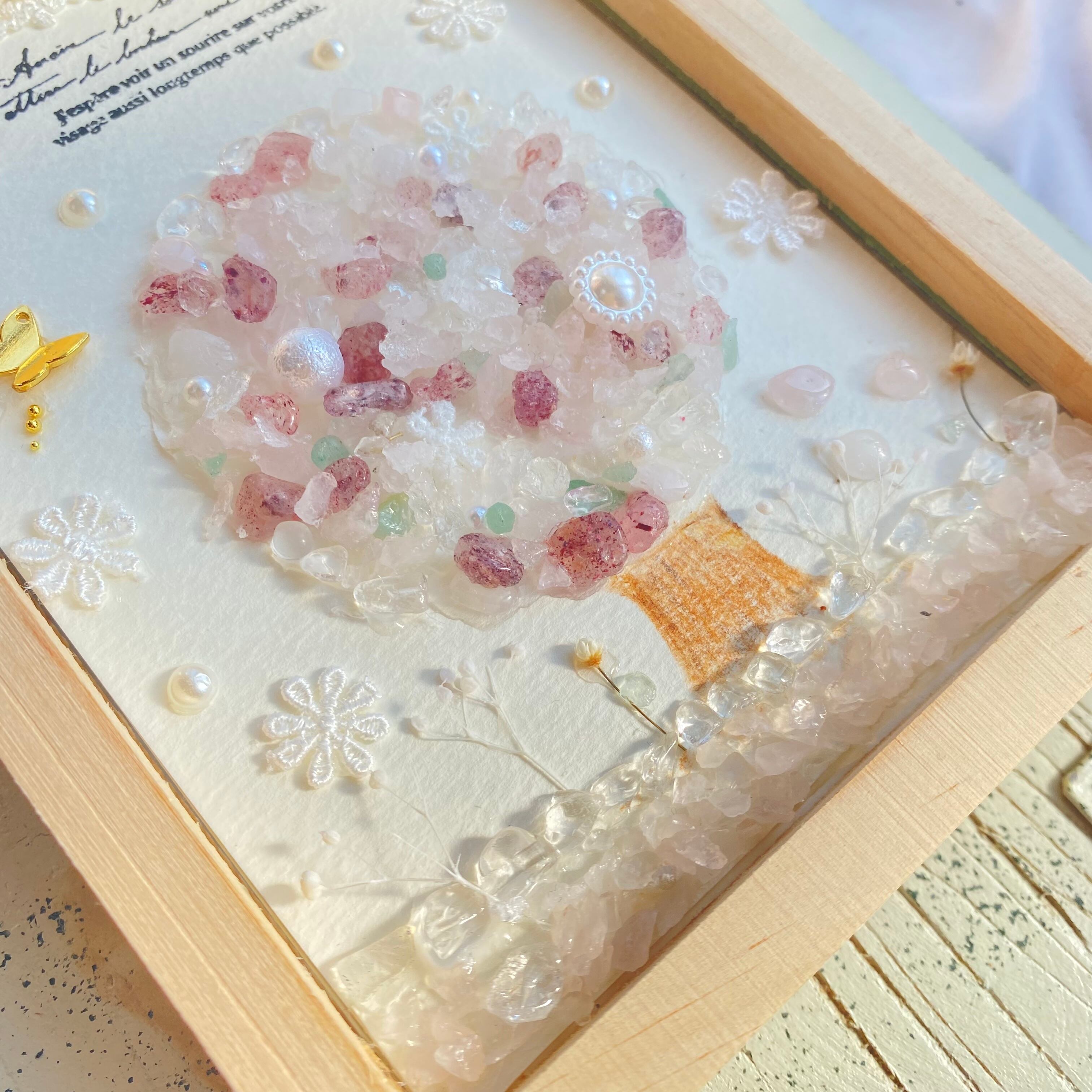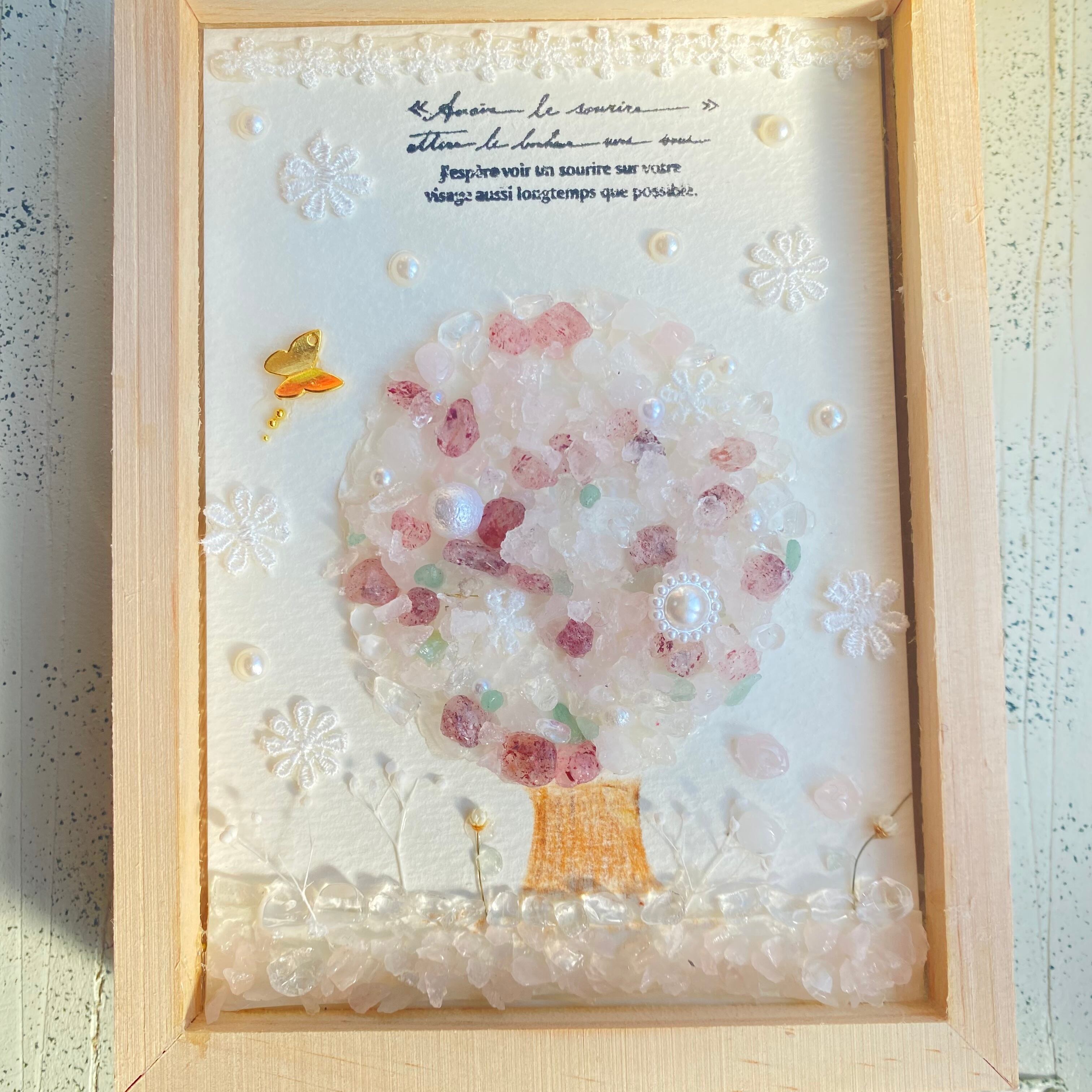 天然石ピンクエピドートとローズクォーツのさざれ石を盛り沢山に使い桜の木をつくりました。