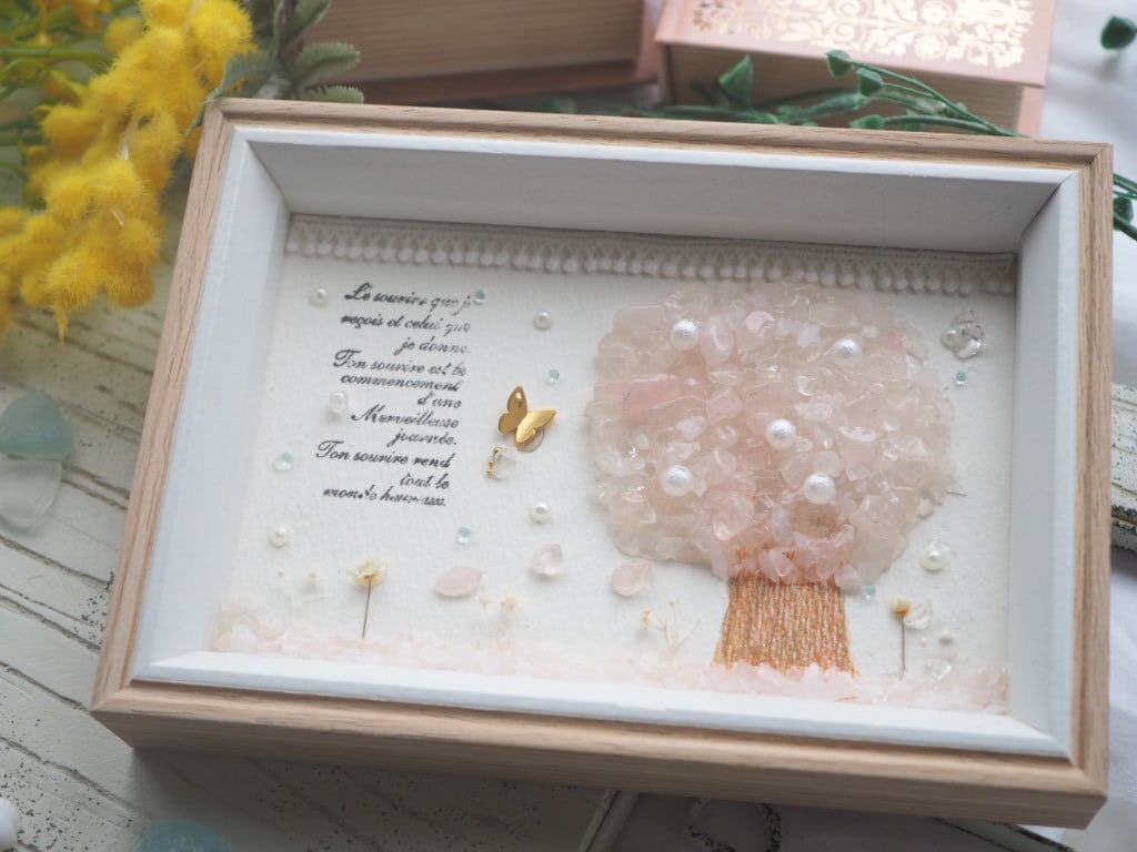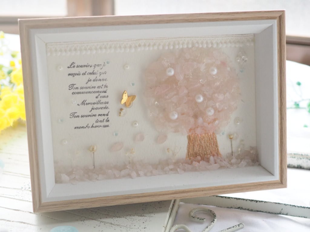 天然石ローズクォーツのさざれ石を盛り沢山に使い桜の木を作りました。
