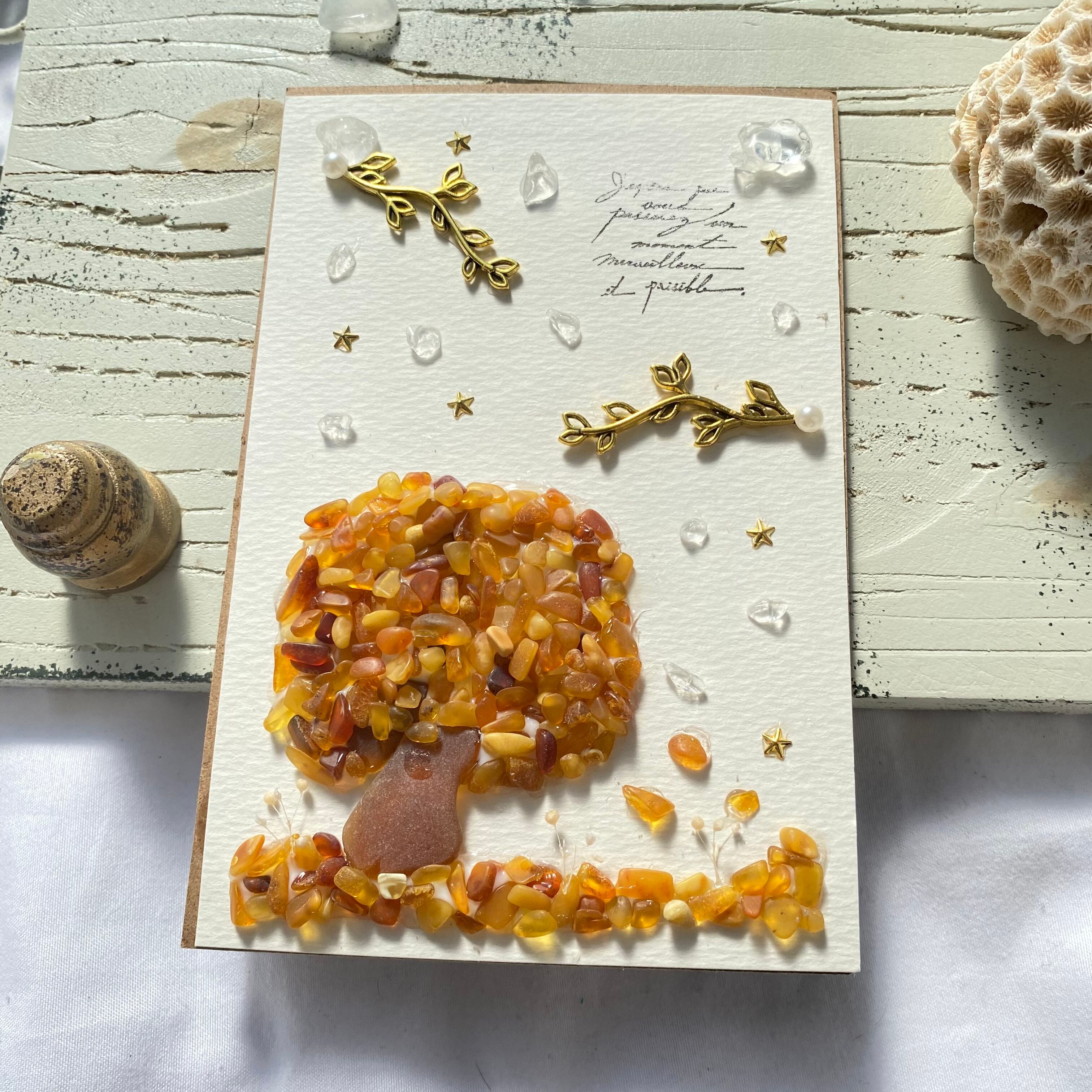 秋の紅葉時期の赤く色づいた葉っぱや木を表現しました。琥珀には健康、金運、エネルギーを高める、長寿、癒しなどのパワーなどがありパワフルな天然石となっています。