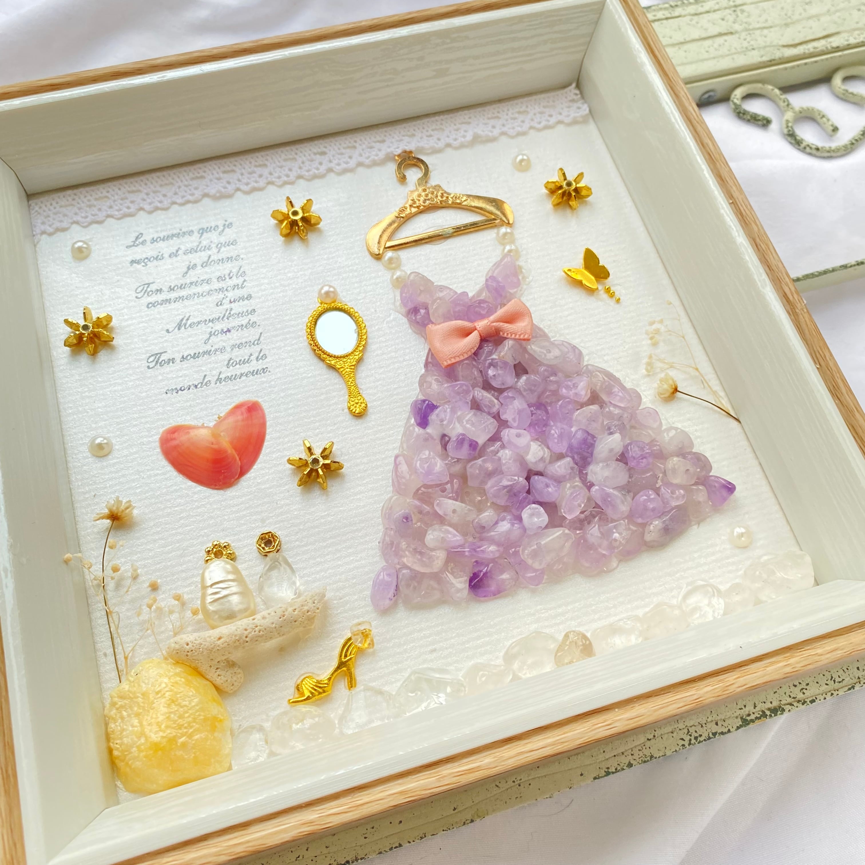 こちらのドレスにはアメジストと水晶を沢山使用しています。
